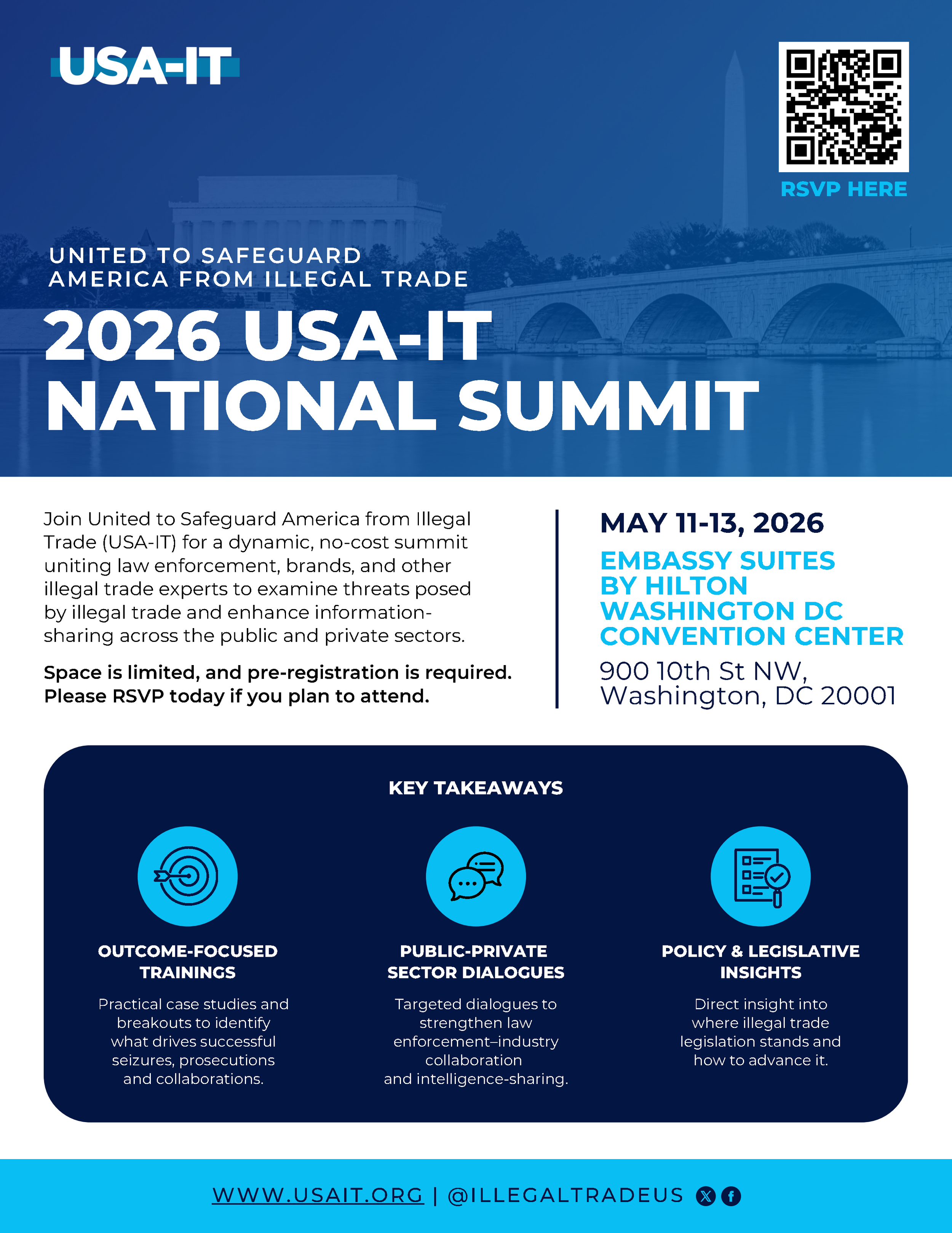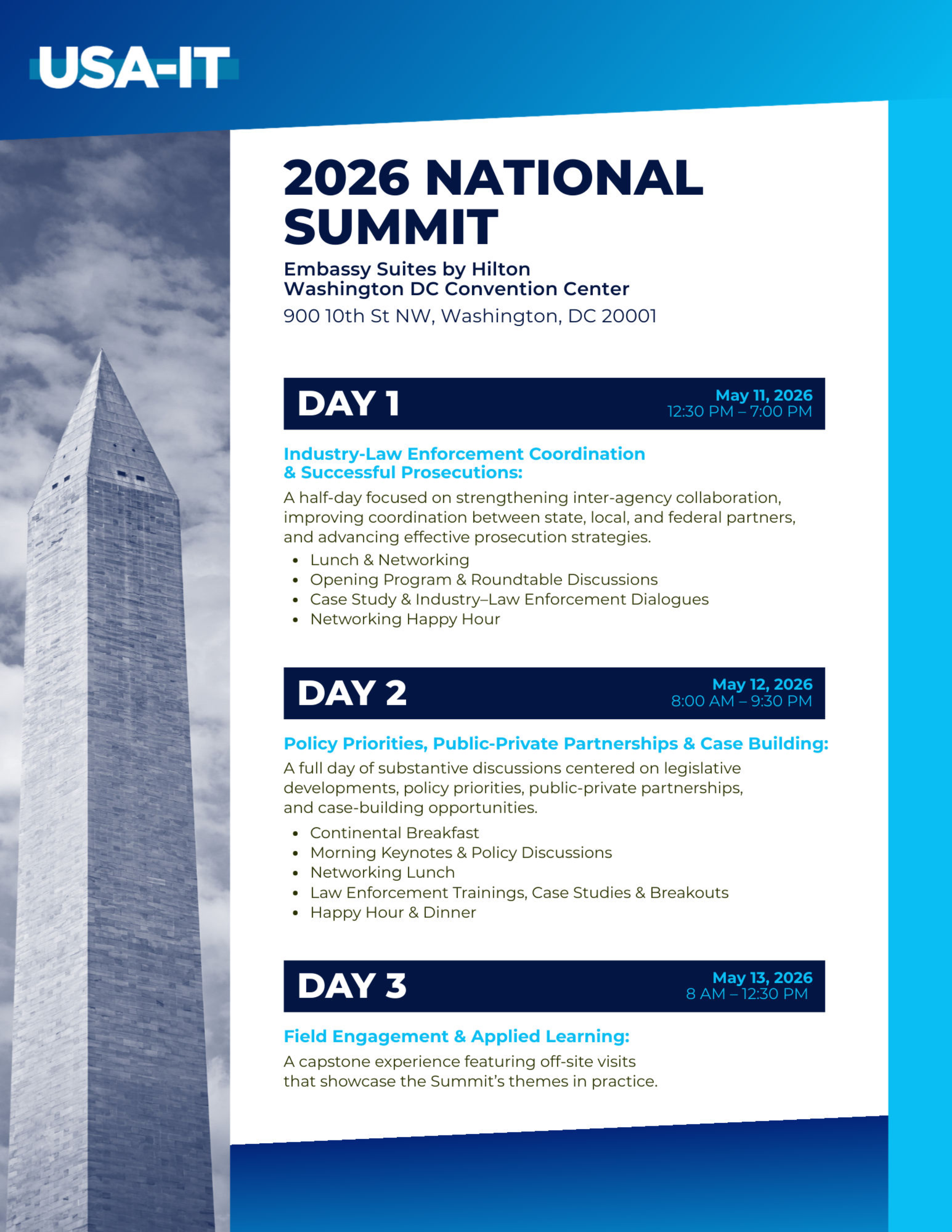 USA-IT National Summit '26 Monday, May 11, 2026 12:30 PM Wednesday, May 13, 2026 12:30 PM Embassy Suites by Hilton Washington DC Convention Center 900 10th Street Northwest Washington, DC, 20001 United States (map) Google Calendar ICS Click Here to RSVP